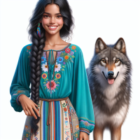 A young, native-American girl who suddenly enters Howell's life. She is accompanied by a wolf. "A long, dark braid flows down the girl’s back. As she smiles, I remember seeing the white teeth that gleamed against her brown skin. Like the other woman, the girl wears a turquoise, loose-fitting blouse. Her ankle-length skirt is covered with flowers, lines and multi-colored symbols"